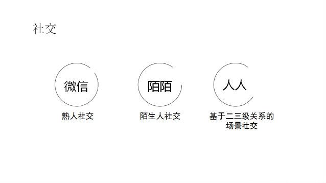 社交依然是不变的主题,热并进化着。子超定义的社交网络有三类:熟人关系社交,陌生人关系社交和二三级的朋友关系即场景社交关系社交。熟人关系对应的是微信系,陌生人关系对应的是陌陌系,二三级的朋友关系即场景社交关系对应的是人人网系。熟人关系社交不用介绍了,而且熟人网络因为熟人社交节点重合,所以只能存在唯一的网络,不能有第二个,因此微信一枝独大。陌生人关系社交虽然很多,但多半是因为寂寞,变化不大,但这类也是强刚需。而唯有场景关系社交未来会有更多的想象空间,场景变化也多样化。在碎片化和个性化的移动社交时代,场景关系社交相对来说比熟人和陌生人社交更加牢靠,场景也增加了O2O的链接可能性。