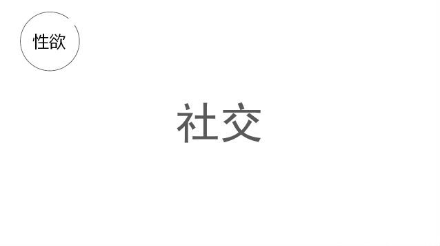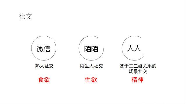 社交网络也可以类比,熟人社交(食欲)基本的社交,陌生人社交(性欲),场景社交(精神)。在社交卡位的时候,如果你去做熟人的产品是不行的,因为微信垄断者;陌生人的社交需要思考你比陌陌强在哪里,如果有可以做;目前场景社交还是一片蓝海,场景社交未来可以诞生出很多有意思的社交产品。