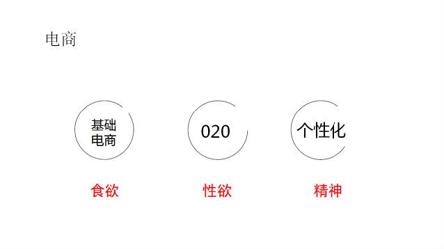 那么依次类推,电商的发展也是三个阶段:基础电商(食欲),O2O(性欲),个性化(精神)。先满足了标准化的商品,而后是高级一些的非标准商品或服务,最后是个性化需求的满足。目前的电商发展阶段,随着阿里巴巴的上市,基础电商发展时代已经结束了,也就是标准化商品和服务的产业链优化的时代已经结束了。随后的O2O的全面爆发,个性化开始初露头角,这里面会有很多机会,可做的产品应该会很多。O2O如今已经进入了平台的争夺之战了,例如百度直达号,搜狐快站,微信公众号,已经不仅仅是美团和点评之间竞争的事情了。