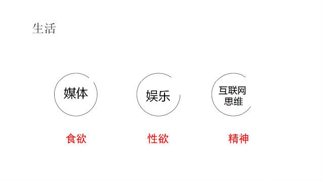 传统生活的升级也需要围绕着人性展开,我们需要基本的日常获取媒体信息,而后是娱乐的生活,最终是享受商业所带来的服务。因此开始传统生活的升级和类比:媒体升级到自媒体(食欲),而后是开始娱乐升级到生活化(性欲),最后到处都是互联网思维的提升(精神),互联网思维影响到生活的方方面面。