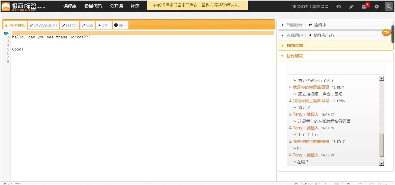 提到Gbtags视频互动播放引擎,就不得不提公共课平台。这个作为极客标签的三大功能之一,它承担了李嘉太多的梦想,这从它的功能上就可以端倪得出。公共课平台中包括一个在线编程指导功能,这类似于一个协作系统,如果老师输入代码,就会自动同步到你这边。另外还有一个类似于YY上麦功能,能自由切换控制方,让参与的人获得控制权。另外,由于支持HTML 5的WebRTC,所以还支持点对点视频、语音沟通。需要指出的是,上面讲的是编程指导功能,只支持一对一的辅导,而公开课形式则支持一对多形式。