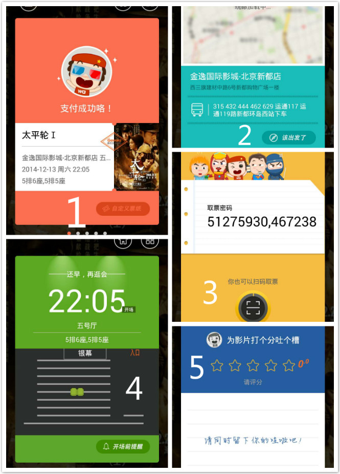 5.第五张卡片是在观影结束后15分钟弹出,就像淘宝购物完成一样,评星加短留言,或者可以点选“哇啦一下”写长影评。