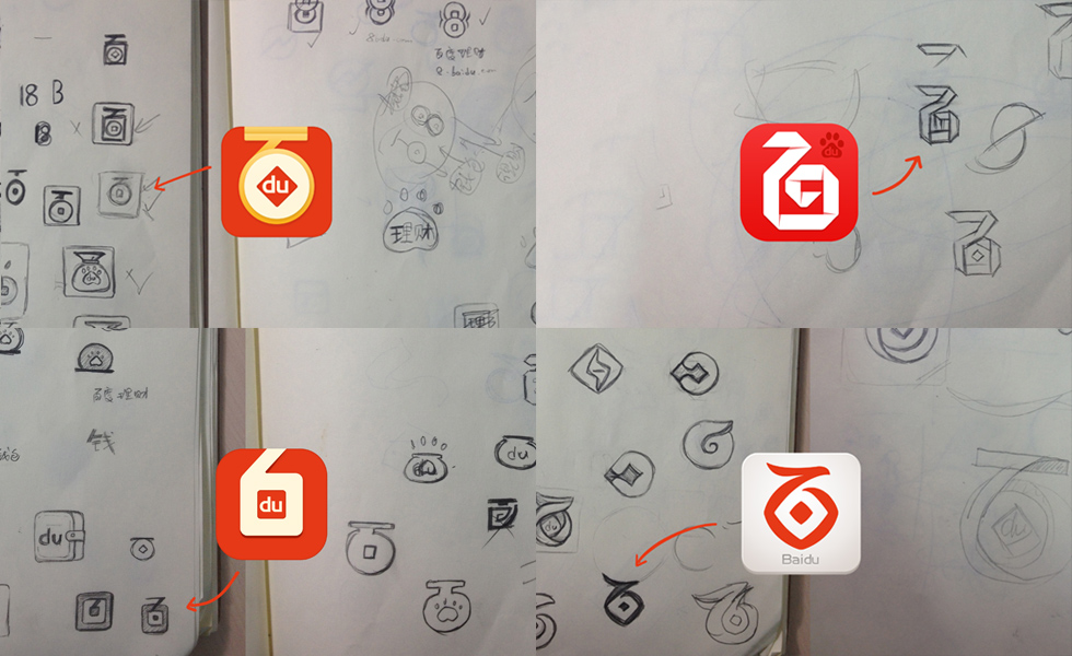 设计方向明确后,我们从多批草图中间取到了一些不错的方案再进行一轮收拢,最终选取一枚再进行细致优化。我们从百度系产品的品牌颜色:经典红色作为了LOGO的唯一主色调。另外目前的设计趋势不断的向简洁和轻快方向发展,因此LOGO也需要考虑这种扁平质感的流行风格。