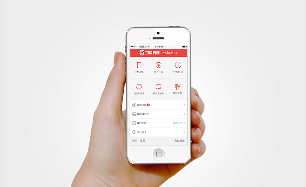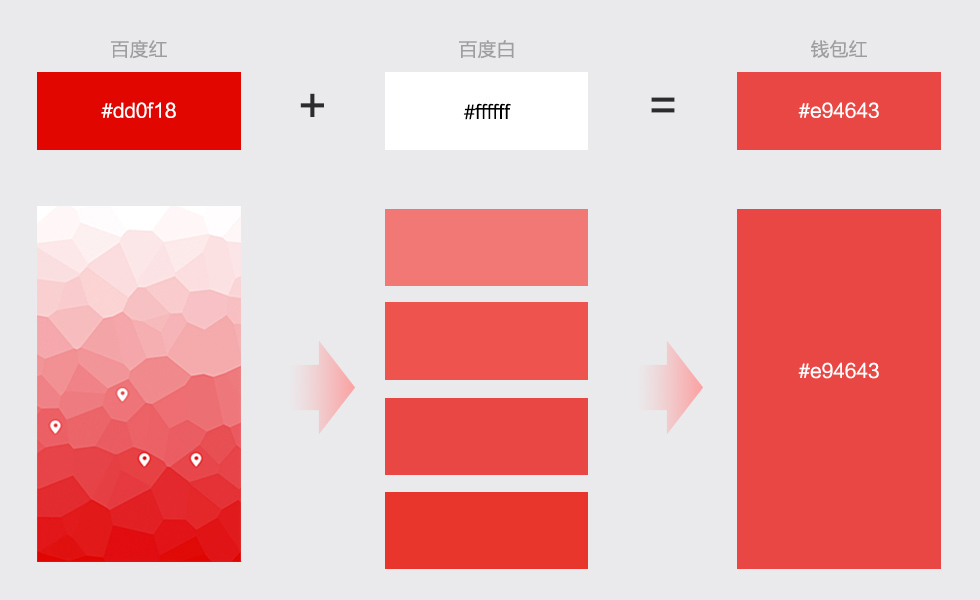 红色是百度钱包品牌色,同时也是百度三大品牌色之一,红色既能体现百度钱包子产品的品牌,也能突出百度的品牌;“钱包红”和“百度红”两种颜色整体饱和度过高,在产品中大面积使用后,长时间的阅读会产生压抑和抵触感,所以在两种品牌色基础上,加入“百度白”进行融合。经过对融合颜色的尝试和筛选,最终确定百度钱包移动页面红色为:#e94643,为品牌定义色。