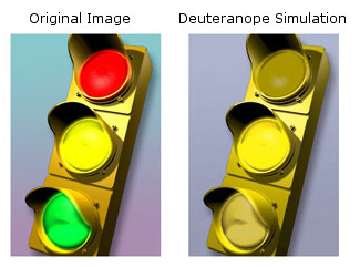ÔÚɫäÈËȺÑÛÖеÄÊÀ½ç£¬Ô¶Ã»ÓÐÕý³£ÈË¿´µ½µÄ¾«²Ê¡£ºìÂÌɫäµÄÈË¿ÉÄÜ»á·Ö²»Ç彻ͨºìÂ̵ƵIJîÒì(ÈçÏÂͼ)¡£ÎÒÃÇÔÚ²úÆ·Éè¼Æ¹ý³ÌÖУ¬Ò²ÐèҪעÒâÕâÒ»µã£¬¾¡Á¿±ÜÃâÓÉÓÚɫäÔÒò¶øÎÞ·¨¸ÐÖªÖØÒªµÄ±ä»¯ÐÅÏ¢¡£