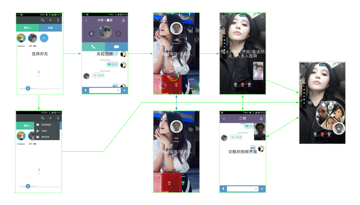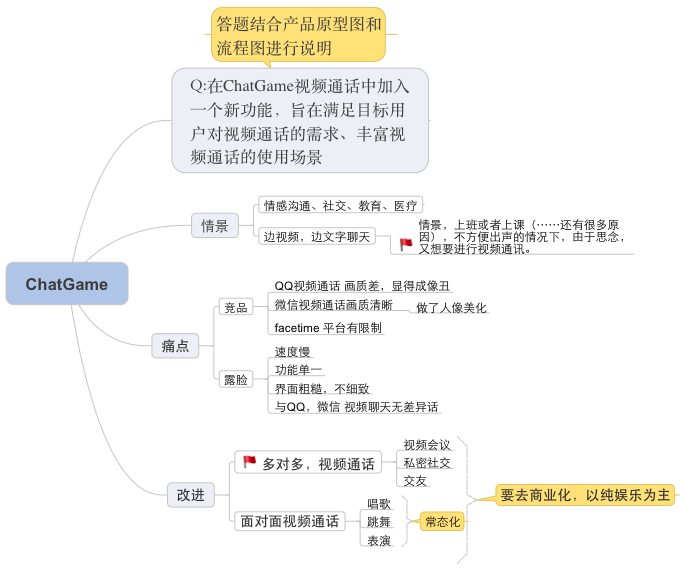 视频通话本身是一个有型的产品,基本也已经成为绝大部分IM功能模块之一,所以要找到与之竞品之前的差异化,并进行分析(再次过程中体验了市面上常见IM视频通话功能),并契合题目目标旨在满足目标用户对视频通话的需求、丰富视频通话的使用场景