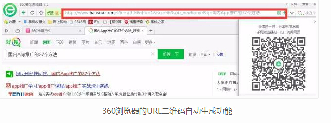 另外,在近期使用360浏览器的过程中,发现360浏览器在每个URL地址的后面都自动生成了一个二维码,这个其实是对二维码的功能的一种使用。二维码有URL生成、名片生成、文本生成等很多功能,通过使用二维码的URL生成功能,可以快速的把PC端的东西“复制”到手机端,而不用借助任何软件。这个就是为什么很多电脑助手用的越来越少的原因。当然这个功能对很多浏览器来说是个创新,至少我曾经使用的谷歌浏览器、搜狗浏览器、TT浏览器都没有这个功能,腾讯的微信因为使用了二维码的功能,让微信之间的用户交互效率提升了一倍,所以说二维码对产品的创新来说是非常一个好的功能。