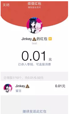 (1)当领到红包的时候,会显示按钮“已存入零钱,可用于发红包“、”已存入零钱,可用于消费“、”已存入零钱,可用于转账“、”已存入零钱,可用于提现”的其中一个,顺序或随机出现;并显示自己所获得的红包金额。