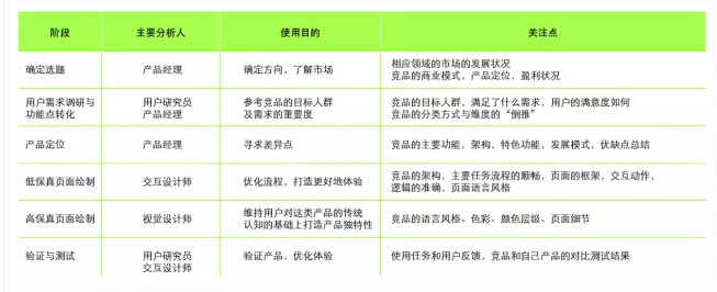 我们知道设计流程是“确定选题-产品定位-用户需求与功能点转化-架构与流程-页面设计-验证与测试”这样大概的一条线(请不要在此纠结,不同项目自然有不同流程),竞品分析在什么阶段会有涉及呢?有的参考书会说有两个阶段,确定选题和验证测试的时候用,不无道理,但是我个人的见解是:方法是灵活的,不分阶段的,重要的是这个阶段你的目的是什么,遇到了哪些问题,这些问题使用什么方法能更高效的解决。
