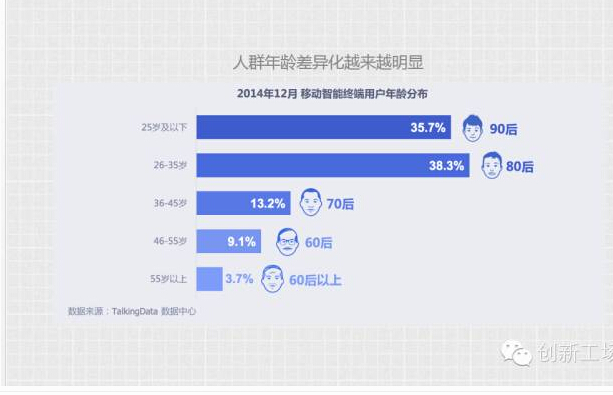 第 一个,为什么要用精细化运营数据?这张图是年初的时候 TalkingData 的一个报告,大家可以看到,整个年龄分布从 90 后到 80 后到 70 后以下,其实整个分布已经越来越均匀了。大家想一下,差不多在 1999年 第一波互联网浪潮到 2004年web2.0 到 2009年 左右的移动互联网浪潮的时候,当时主要人群主要是 80 后,并没有现在分化得这么明显。