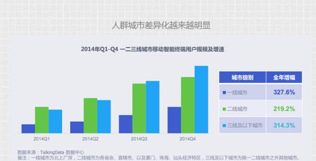 第 二个人群城市差异化,大家可以看到一二三线城市的增长速度,意味着人群包括像城市整个沉降越来越快,如果有来自小城市的朋友都知道,现在回家看,大家使用 智能设备已经越来越多了。大家再想一下,这三个浪潮的时候,最开始使用互联网的人主要是一二线城市的人,而现在这个图是一个金字塔,三四线人才是一个更有 价值的部分。