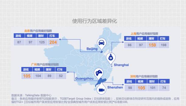 最后一个是根据每个人装的应用列表来看,北京打车偏多,上海理财,广州是游戏,深圳是视频。从表面上来看是几个类型的差异,背后刚好反映的是各个城市人群的 生活节奏,包括个人作息时间,个人消费能力等等。这意味着什么呢,这意味着现在包括使用你的应用人群已经越来越差异化了。