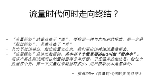 这个是前一段时间 的一篇文章《流量是在何时走向终结》,它的观点就是以前流量经济在于洗,我不停的去找,有当量的渠道去换流量,现在已经是讲究粉丝经济了,要养,要找到你的用户人群特点。