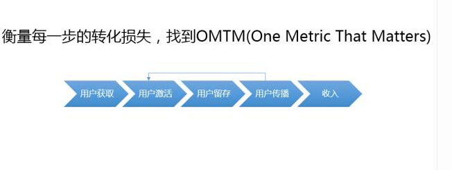 先找到 OMTM,这个概念是来自于《精益数据分析》这本书,里面讲到一个很重要的分析方法论叫做 OMTM(one Metric That matters)。在找瓶颈的时候往往有一个非常重要的因素,只要解决了这个问题,就会带来快速的提高。本身你的产品在迭代,不可能一下子解决所有的问 题,你做很多操作的时候,到底是哪个产生因素还是不知道,从分析上来讲是不合理的。