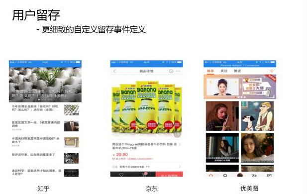 但是现在很多 APP 的开发者会发现一个很头疼的问题,就是为什么我们的量增不上去,觉得自己做了很多努力还是没有太多的用户,这里面有一个很重要的问题,就是你没有分析你的 应用,没有意识到为什么用户留存率偏低。包括现在很多产品会去换量,A 产品跟你换 5000 量,B 产品换到 3000 量,你简单认为 5000 大于 3000 对不对,有些公司稍微再精明一点会去看留存率,即使是留存,大家想一想,每个应用的核心事件不同,知乎就是看帖子,京东是是加入购物车,搜狐视频是看视 频。