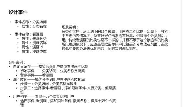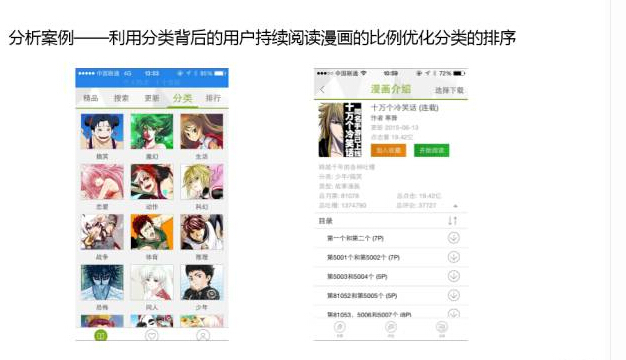 因 为 APP 展示页面有限,每一个关键部位都是有它的价值,这个时候要明确横向从上到下的点击比例。第二个,每一个点进去的用户有没有持续使用这个分类,在这个分类里 面看这个分类的漫画,显然这个比例肯定是不一样的。这个时候下面有一些是高于上面的,持续用这个分类的比例是高于上面的,这个时候要根据数据把下面提多上 面去。
