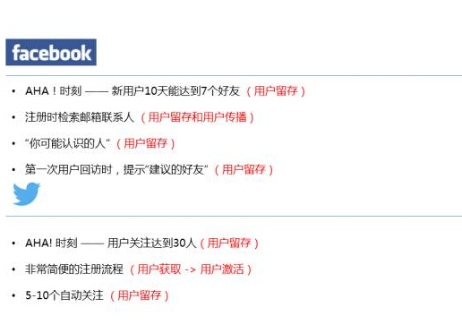 Facebook 和推特这里面有两个概念,AHA 时刻,大家可以去 TD 上搜一个东西叫做 Facebook 的 growth 团队做的一个分享,AHA 时刻在国外叫 AHA moment,Facebook 和推特也遇到了这个问题,好多人注册了不留下来,其实就是用户获取到用户激活到用户留存这部分,后来经过数据分析发现当一个新用户十天能达到 7 个好友的时候,这个留存率是最高的,这一件事很多产品团队没有数据分析意识是不会想到的,这一件事其实是可以分析出来的,这些人的整个行为分布和使用是有 规律在里面的。推特用户关注达到 30 个人,这也是符合逻辑的,刷的量太少了就不会有人使用了。