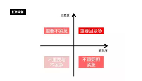 >>任务规划:将工作项按照重要程度和紧急程度划分四个等级,按照优先级来处理。最先处理的肯定是重要且紧急的事情,完成上一步之后再去处理紧急但不重要的事情,同时提前规划好重要但不紧急任务的排期,最后才是处理那些既不重要也不紧急事情。