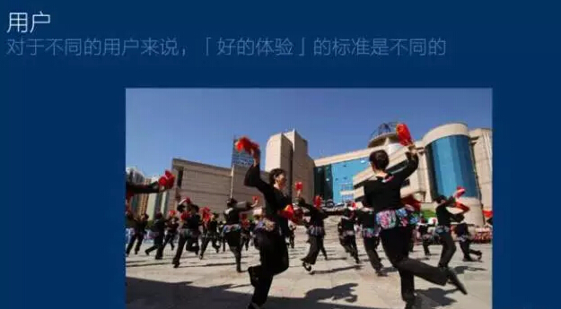 对于不同用户来说,好的体验标准是不一样的。广场舞对广场舞的大妈来说,用户体验很好,每天跳得特别嗨。但对周边居住的居民来说用户体验肯定是不好的,因为太吵了。