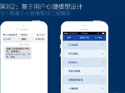短信告诉你招商银行,卡号,户名——交房租时候怎么办呢?先看不好的案例,事实上你的任务是要转账,知晓对方银行,卡号,户名。你打开某银行手机应用时候,找到转账汇款的入口,进去后却是一堆列表项(如图中右侧所示),这就是典型的基于业务模型设计,而不是基于用户心理模型设计:其在转账汇款中罗列了很多转账方式,对于银行业务的话,专业的金融角度来看,相关的业务可能确实是按照这样的方式划分的。但对于用户来说,真的能知道要选哪个么?或者我们只考虑一个最简单的问题,如果你在汇款的时候选择对方是招商银行,难道app还判断不出这是要进行行内转账还是跨行转账吗?
