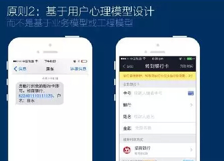 在支付宝选择转到银行卡后出现如上界面,这个界面上的操作项,和房东的短信的内容几乎一样。也就是说把钱给对方,只需对方提供:卡号,姓名,所在银行,金额即可——这样的设计才是基于用户的心理模型的设计(这是比较好的用户体验案例)。