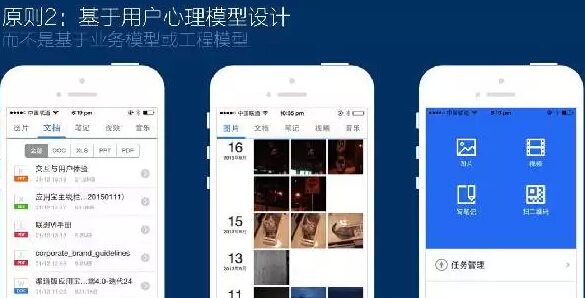 新版本中,用了新的、更现代的视觉风格,信息架构是以用户存储在网盘的内容为核心——可以快速切换,而不是旧版本那样主界面进去是三个入口。包括设置了不同的信息展现形式:timeline照片展现形式,快捷筛选等,以及优化了上传流程——那用户集中骂的点在哪里?