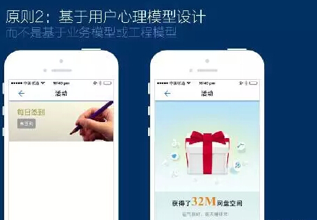 微云的每日签到和常见的签到体系是差不多的,就是每天从应用里的某个位置点一下,可以获得一定的赠送空间。当时的情况是网盘大战时期,其他竞品都推出了很好的运营活动:送几百GB空间,甚至几T空间。因为网盘存储空间是用户最核心诉求之一,做个人网盘的运营——送空间会获得最好的效果。微云当时的运营策略:只要登录手机客户端,进行几个操作,就可以轻易获得10个T的空间。所以当时的想法是——如果你是一个用户,既然你有10个T的空间,并且考虑到中国的网速,考虑到一些实际情况,对于大部分用户来说10个T的空间一辈子都用不完。所以基于这样的业务模型,想法很简单——你有10个T的空间,每天送你的几百兆空间你还需要吗?觉得不需要。所以在新版本发布的时候,暂时隐藏了签到的功能,当时想的其实并不是干掉这个功能,而是后期想要通过一个完整的用户等级和积分体系来替换这个功能。
