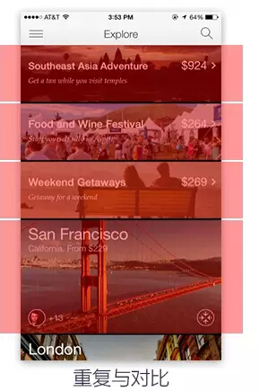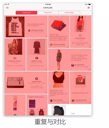 设计和做其他事情一样,也要有轻重缓急之分,不要让用户去找重点/需要注意的地方,应该让用户流畅地接收到我们想要传达的重要的信息。重复和对比是一套组合拳,让设计中的视觉元素在整个设计中重复出现既能增加条理性也可以加强统一性,降低用户认知的难度。那么在需要突出重点的时候就可以使用对比的手法,例如图片大小的不同或者颜色的不同表示强调,让用户直观地感受到最重要的信息。