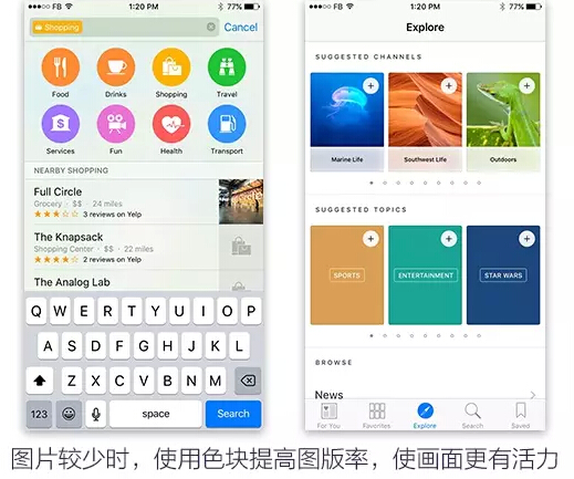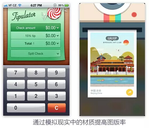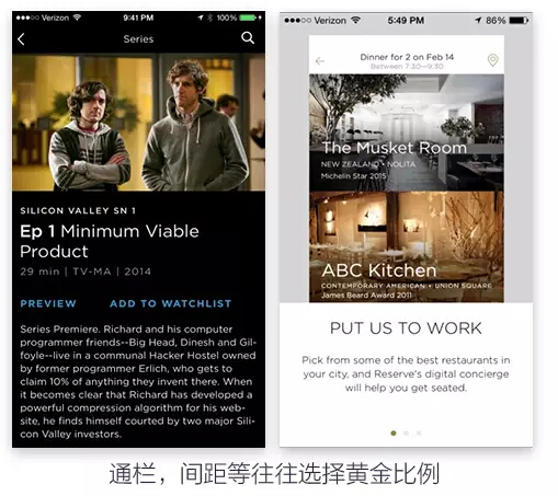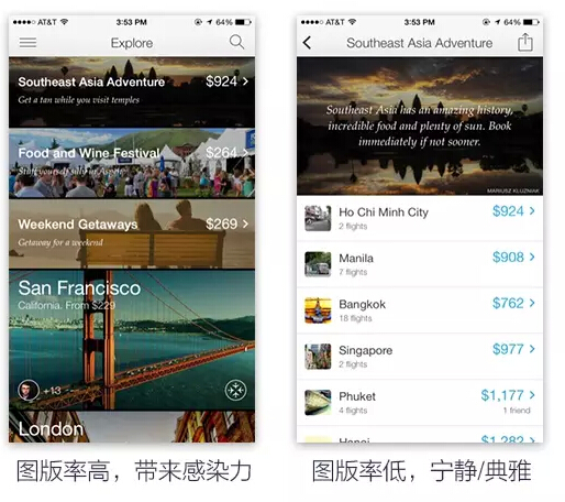 app的页面结构和文本确定之后,就要开始安排图标/按钮/图片的安排了,这时页面也就从单纯文本的“阅读”型结构调整为“观看”型结构,对于页面的易读性以及页面整体的效果会产生巨大的影响。页面中图片所占的比率叫做图版率,通常情况下降低图版率会给人一种宁静典雅、高级的感觉。提升图版率会有充满活力,使画面有富有感染力的效果。