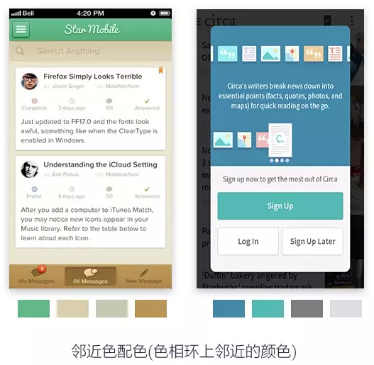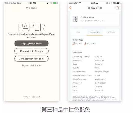 第四种是中性色配色,用一些中性的色彩为基调搭配,弱化干扰。这种方法在移动端是最常见的方法。
