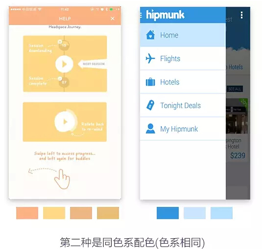 第二种是同色系配色(色相一致,饱和度不同),主色和点晴色都在统一的色相上,给用户一种一致化的感受。