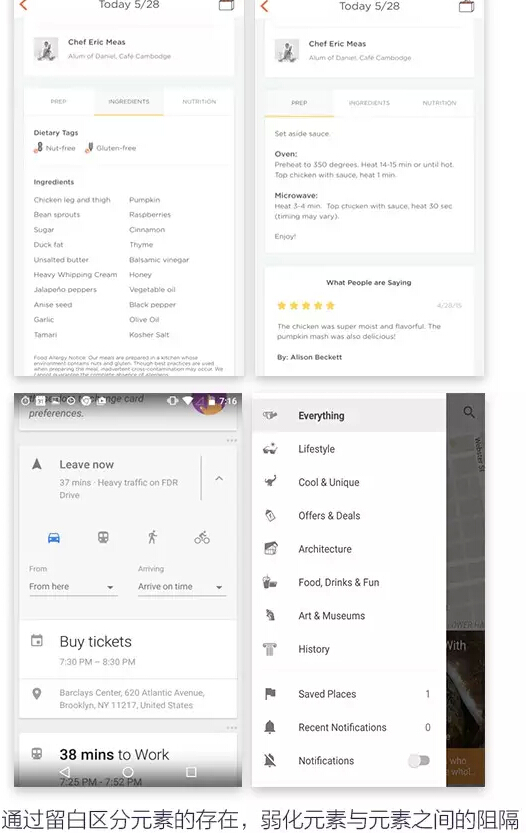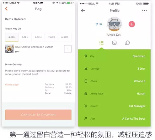 第二通过留白区分元素的存在,弱化元素与元素之间的阻隔。表单项与表单项之间,按钮与按钮之间,段落与段落之间这种有联系但又需要区分的元素用留白的方式可以轻易造成一种视觉上的识别,同时也能给用户一种干净整洁的感觉。
