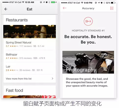 第四留白赋予页面构成产生不同的变化。版式设计中要有节奏感,这也是我一直强调了。传统杂志在每一页翻开都会有不同的视觉感受,我认为在app内很多板块之间的也是可以局部去突出个性或特点的。留白可以赋予页面轻重缓急的变化,也可以营造出不同的视觉氛围,通过留白去改变版式再配合四大原则可以产生出不同的效果。