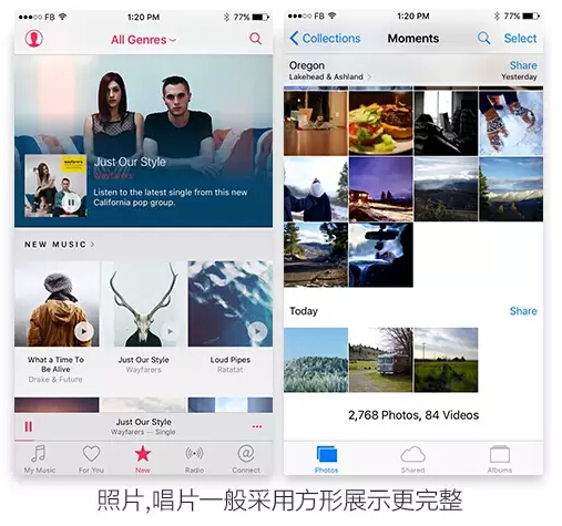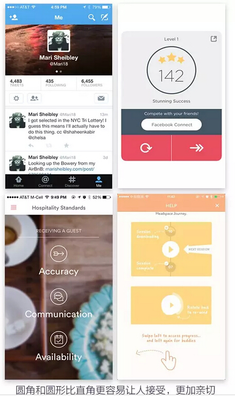 在界面排布中,往往圆角和圆形比直角更容易让人接受,更加亲切。直角通常用在需要更全面展示的地方,例如用户的照片,唱片封面,艺术作品,商品展示等地方。在个人类的feed或者头像,板块的样式等使用圆角会有更好的效果。