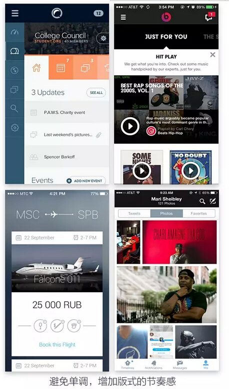 在全局页面的排版中也要避免单调,增加节奏感。在上文我也提到过排版要有轻重缓急之分,这样让用户在观看的过程中不会感到冗长,无趣。
