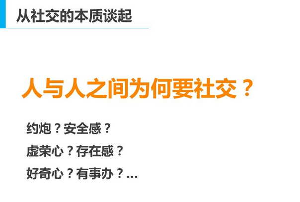 谈到社交,大家往往会想到“约炮”,也会想到一些心理需求,比如安全感、虚荣心、存在感、好奇心,又或者生活工作的需要——有事情找人办,又或者想要拓宽人脉、提升影响力……