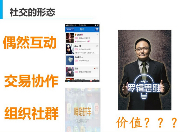 - 你在uber或者滴答上完成一次交易,双方同时进行了社交,这是一次交易协作的过程。