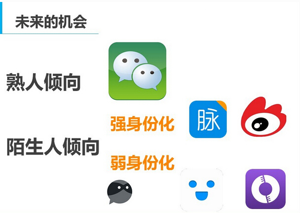 熟人倾向基本在未来想要做得比微信更好恐怕是很难了。陌生人倾向中又会有强身份化和弱身份化两类。强身份化的产品,如脉脉,往往能够对自己的个人形象进行增值,需要用户想要主动去认证。弱身份化产品,比如用户需要一个平台去释放自己的社交压力,寻找排解寂寞的方式。