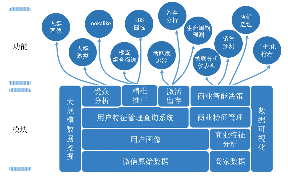 用户特征管理查询系统的外层是面向商家和运营人员的三个模块:受众分析、精准推广和激活留存。下面我来逐一介绍。