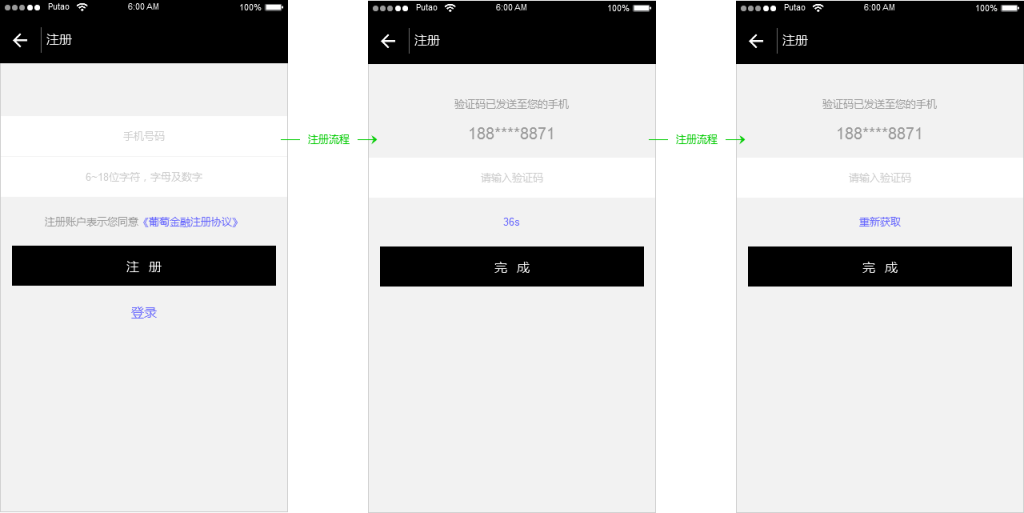 其中,在用户不登录的情况下,个人账户对用户是不可见的。但当用户再次遇到不可多次操作或者比较繁琐的操作时(比如实名认证提交信息的过程,或者申请贷款需要填写的大量的个人信息),用户输入手机号、获取验证码的过程中,就需要判读该账号在之前是否操作过,如果有则提醒用户直接登录即可查看相应的结果,若没有则继续该项操作。所以,在操作流程比较长的情况下,建议将校验手机号的部分尽量设计到流程的最开始或者靠前,这样可以及时的提醒用户减少不必要的操作,用户体验相对会比较好;若等用户所有信息都输入完之后,才去校验,这对用户来说,是很大的伤害。
