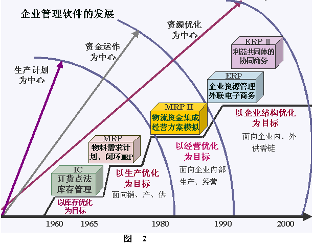 借用ERP资深专家陈启申老师的一幅图(图3),清晰地描述了从MRP到ERPⅡ的发展过程。可以看出,ERP系统不是突然冒出来的,它是在MRP、MRPⅡ的基础上发展起来的。MRPⅡ包含了MRP的功能,又增加了财务会计和管理会计的功能;而ERP包含了MRPⅡ的功能,又增加了供需链的管理,也就是超出企业内部管理的功能。正在发展的ERPⅡ既包含了ERP的功能,又增加了协同商务所必须的技术和相应的功能,突出在异构平台之间的信息集成。