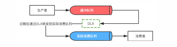 延迟消费是延迟队列最为常用的使用模式。如下图所示,生产者产生的消息首先会进入缓冲队列(图中红色队列)。通过RabbitMQ提供的TTL扩展,这些消息会被设置过期时间,也就是延迟消费的时间。等消息过期之后,这些消息会通过配置好的DLX转发到实际消费队列(图中蓝色队列),以此达到延迟消费的效果。