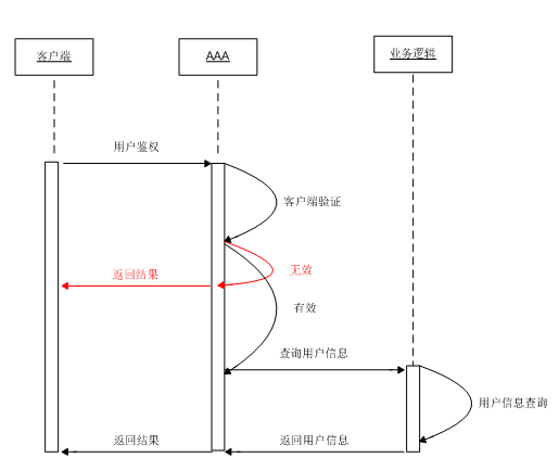 以用户鉴权为例,它涉及到手机用户、CP网关、AAA服务器和业务逻辑模块四个独立的功能,它具体的业务流程如下所示,因为手机用户通过CP网关联入系统并由它发出对用户鉴权请求,然后将鉴权结果返回手机用户,为避免图形的复杂性,这里将手机用户和CP网关和二为一,统称为客户端。它的业务流程图用UML顺序图表示如下: