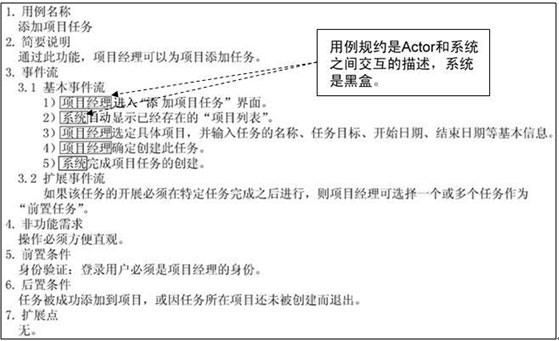 事件流以Actor参与者或“系统”作为主语,使用主动语句; 谨记用例是“黑盒”。描述语句只能描述Actor可以看见的交互,而不能描述软件内部的情况(打开数据库连接对象、执行SQL语句等等);