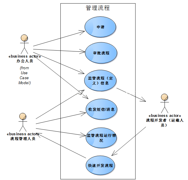 需求分析借助UML建模工具EA,通过EA进行业务建模和开发需求用例和对象模型。此段重点关注业务建模实践过程,回答办公业务流程平台要做什么?