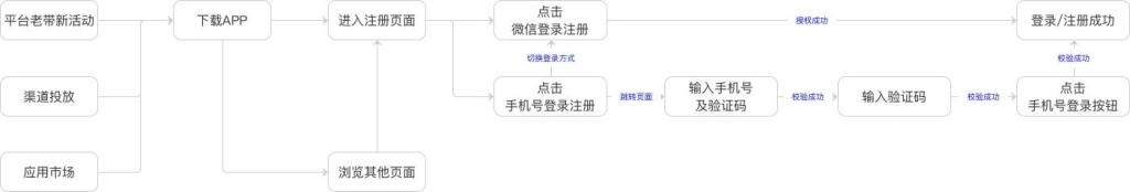 根据图4,我们可以列出如下的公式:APP注册人数=手机号注册人数+微信注册人数微信注册人数=进入注册页面人数-进入注册页面人数*跳失率-登录人数-点击手机号登录注册人数手机号注册人数=进入注册页面人数-进入注册页面人数*跳失率-登录人数-点击微信登录注册人数-进入手机号登录页面人数*跳失率-选择切换登录方式人数-输入手机号未获取验证码人数-输入验证码未登录人数