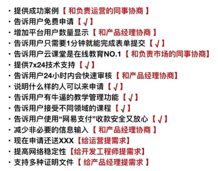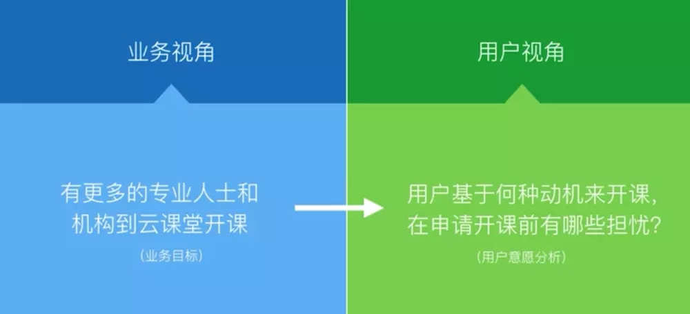 这是业务需求分析的结果,产品的设计者希望提高申请点击率,从而实现更多的专业人士和机构来云课堂开课这个业务目标,但是用户愿不愿意来呢?要打成业务目标,我们要让自己从业务视角转化为用户视角。