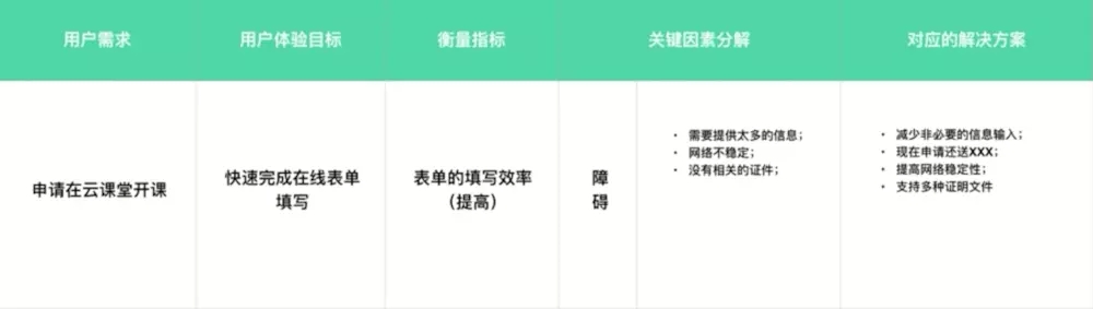 对于用户需求的分析,用户体验目标本身就是用户视角的,所以只需要进一步分解用户在填写过程中有什么障碍就可以了。