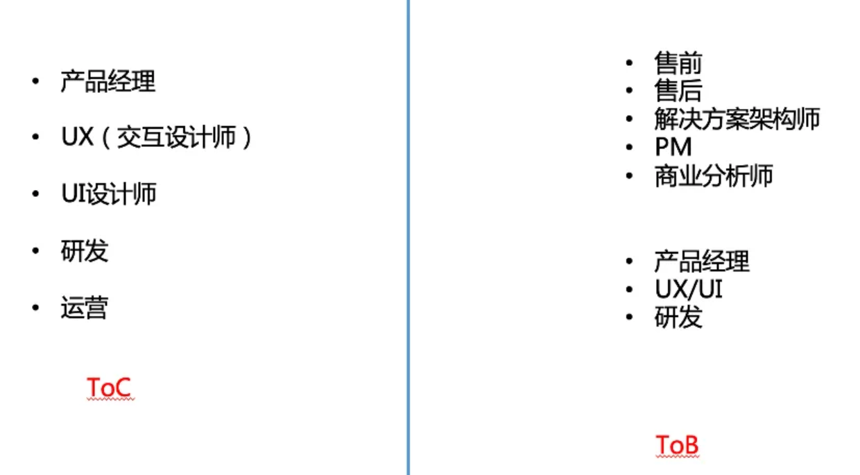 ToC与ToB都做产品,上面讲的是共性,接下来讲差异。 在对应岗位上,有明显体现: