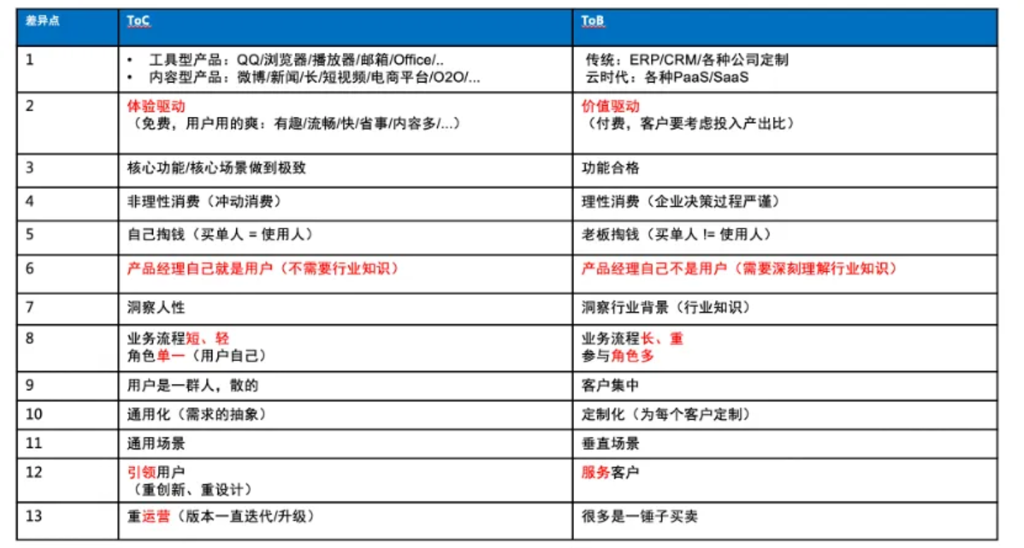 下面表格列举了ToC与ToB在做产品上的一些关键差异点: